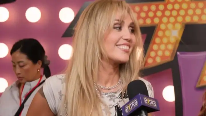 Miley Cyrus chegou depois de outras figuras do seriado e surgiu loira, em referência à identidade da personagem, usando um vestido prateado com uma imagem de Hannah estampada.